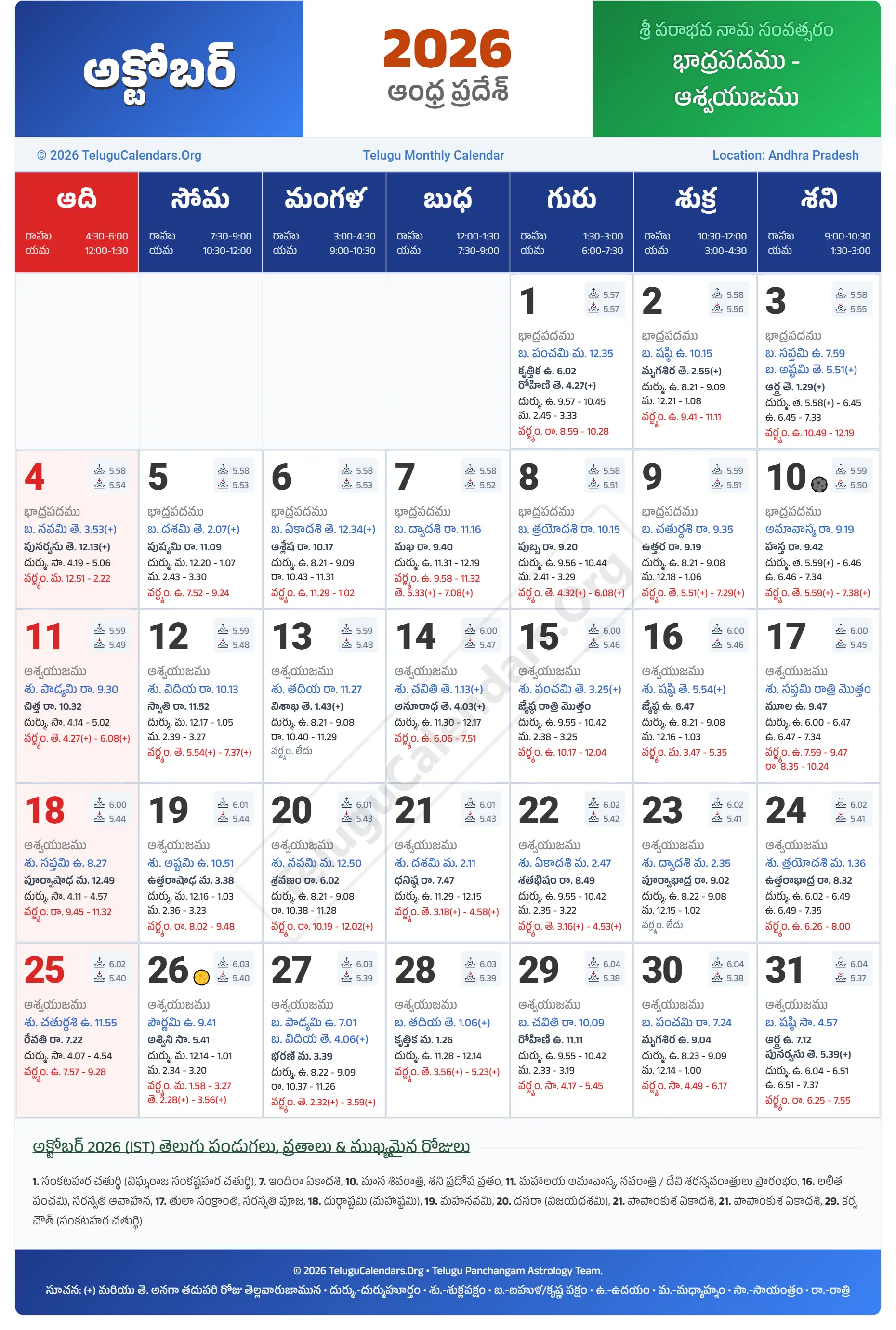 Andhra Pradesh Telugu Calendar 2026 October PDF Download