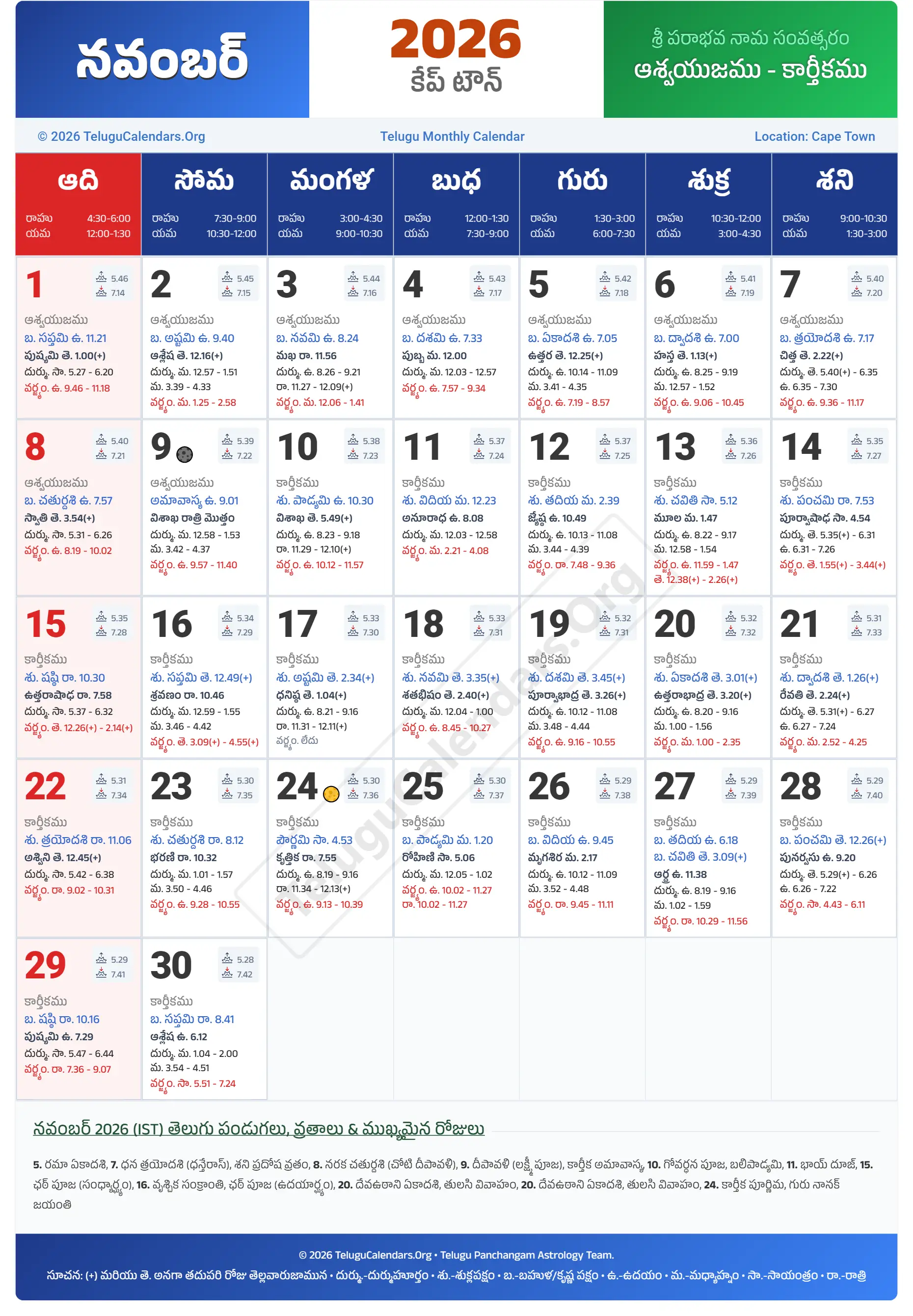 Cape Town Telugu Calendar 2026 November PDF Download