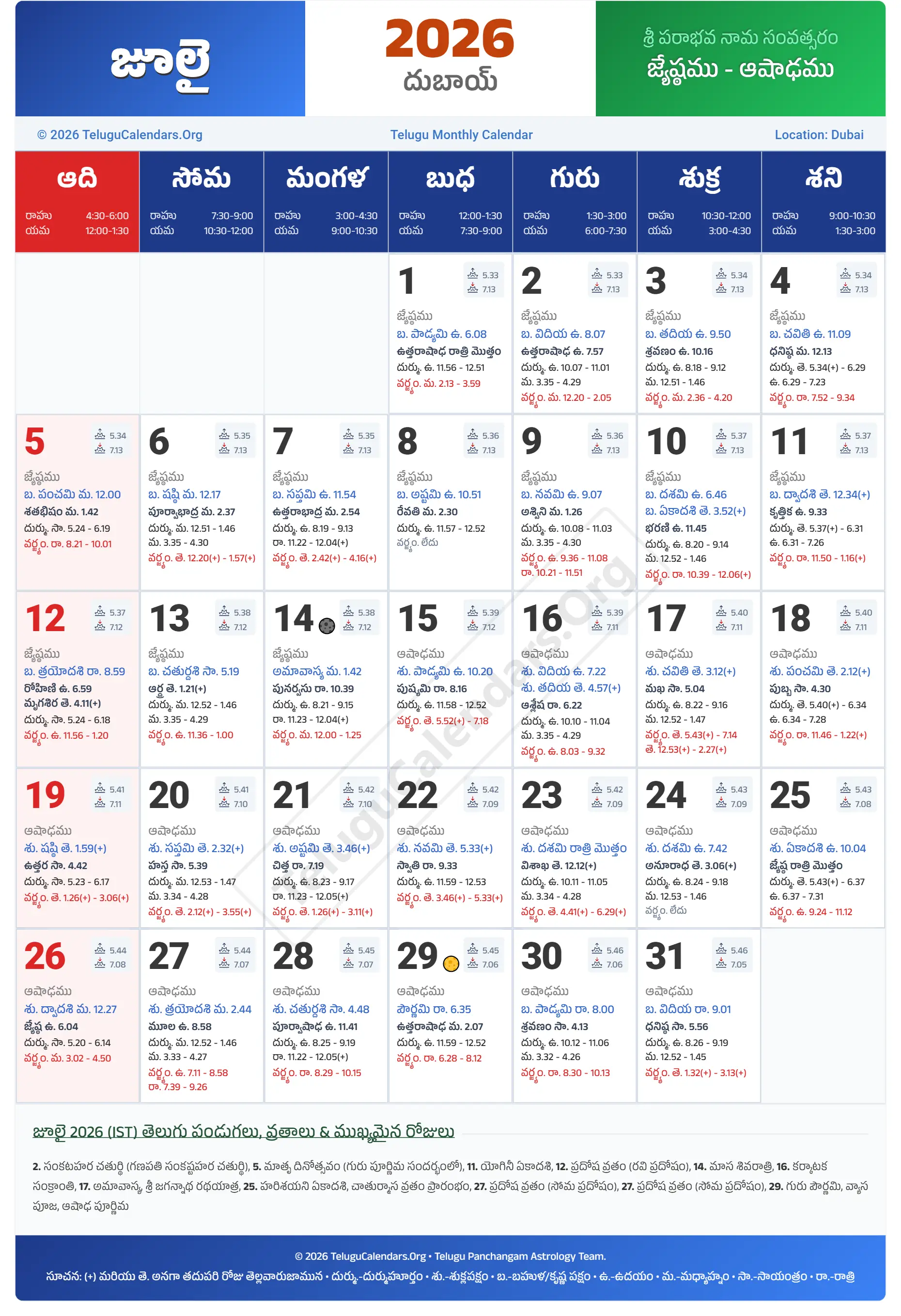 Dubai Telugu Calendar 2026 July PDF Download
