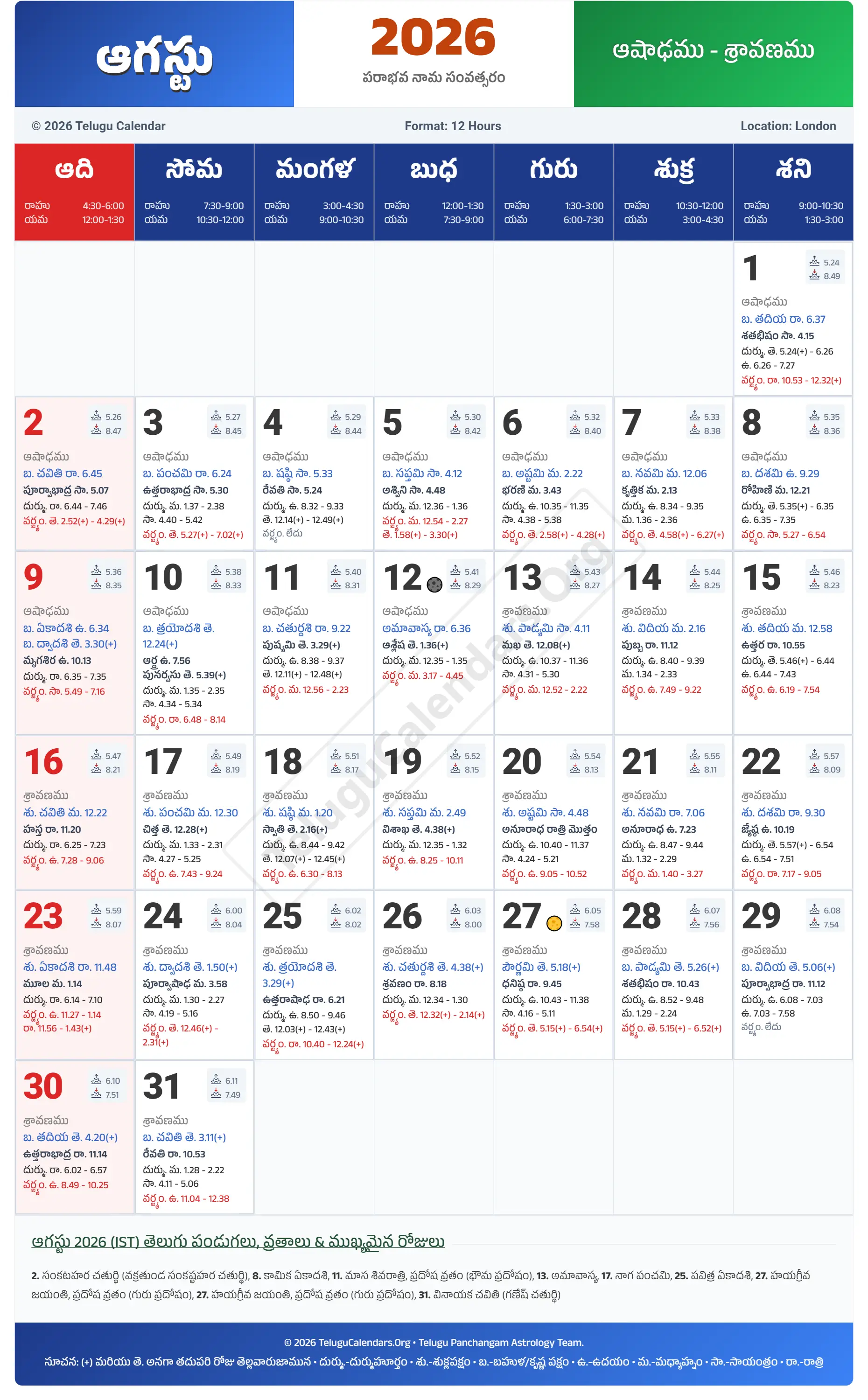 From an astrological perspective, Ekadasi is considered a highly auspicious window for spiritual fasting and devotion. According to the regional Panchangam for London, we observe 2 Ekadasi tithis this month. The first one occurs in the lunar month of Ashadhamu on Sunday, 09 August 2026, with timings officially recorded as Ekadasi upto 06:34 AM. The next one occurs in the lunar month of Sraavanamu on Sunday, 23 August 2026, with timings officially recorded as Ekadasi upto 11:48 PM. Devotees are advised to plan their fasts and prayers strictly within these specified timings to maximize their spiritual and cosmic benefits.