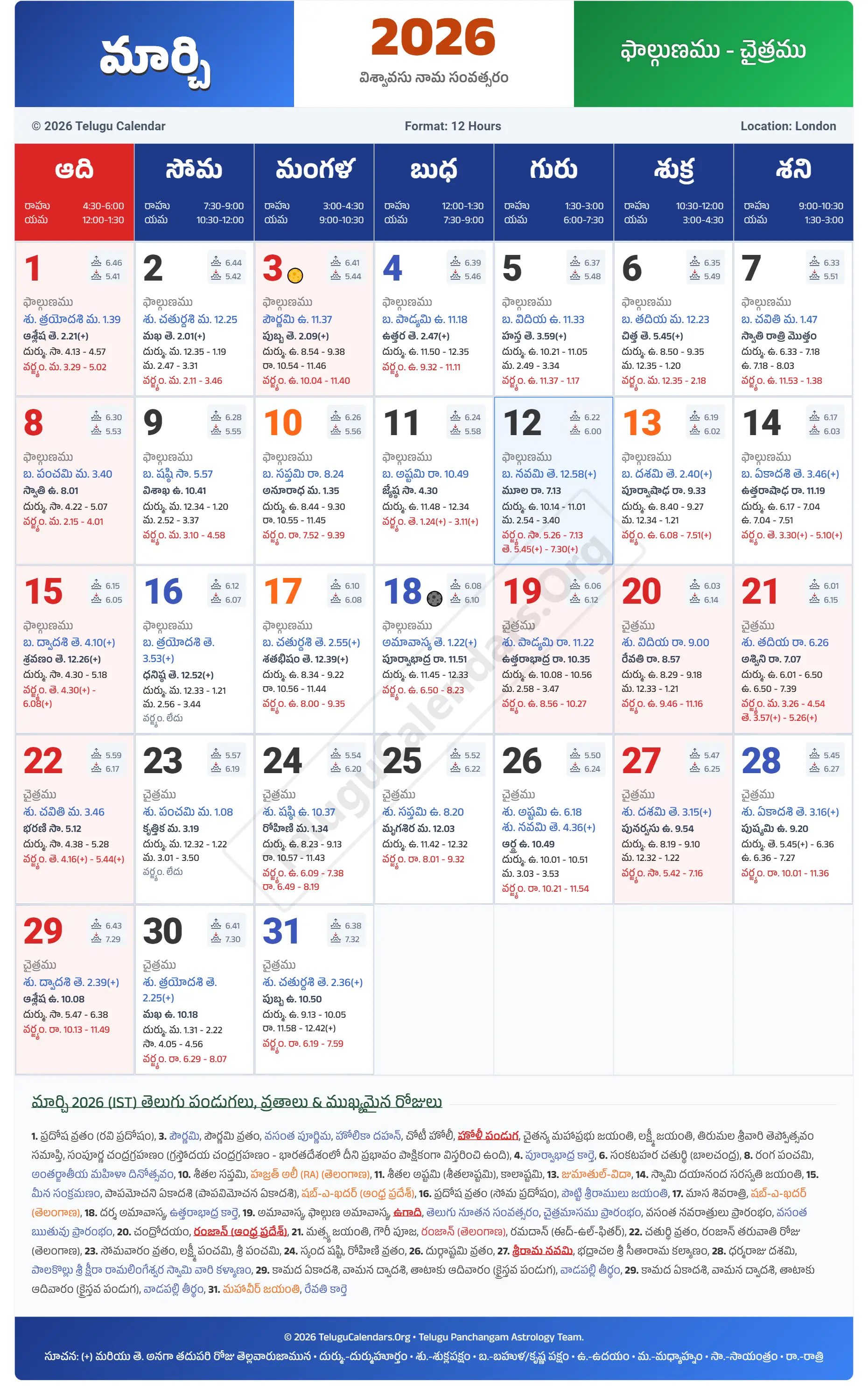 London Telugu Calendar 2026 March PDF Download