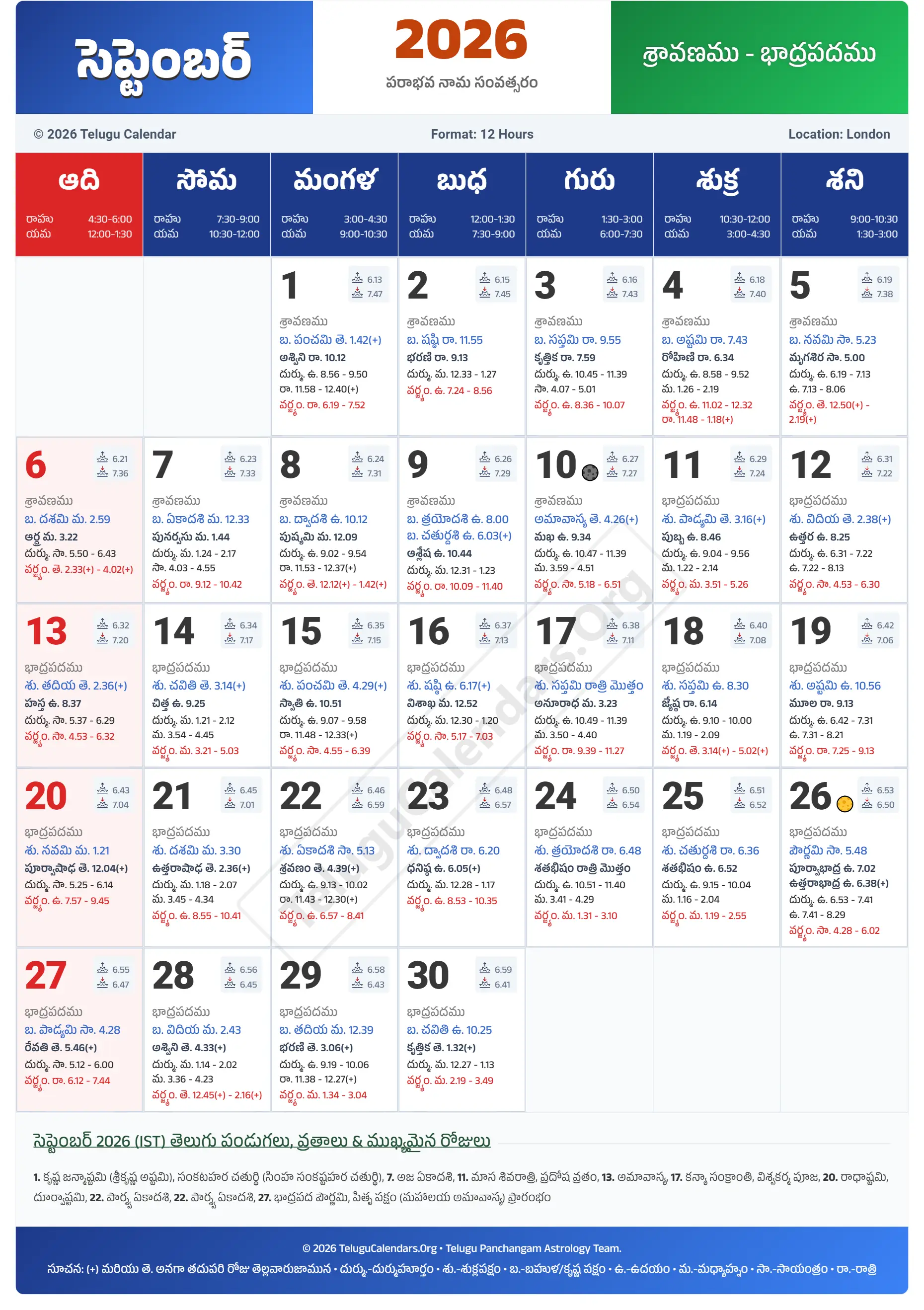 London Telugu Calendar 2026 September PDF Download