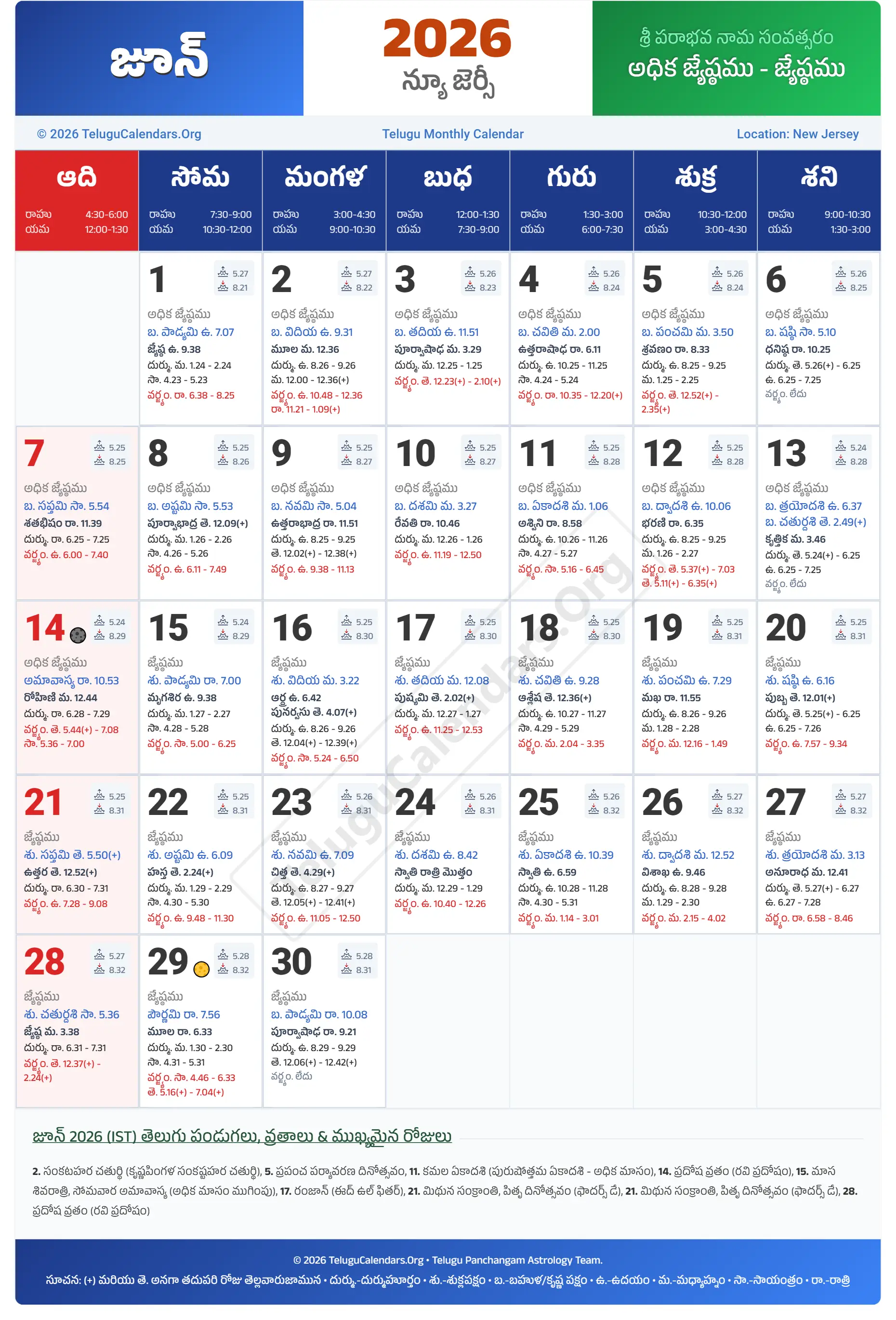 From an astrological perspective, Ekadasi is considered a highly auspicious window for spiritual fasting and devotion. According to the regional Panchangam for New Jersey, we observe 2 Ekadasi tithis this month. The first one occurs in the lunar month of Jyesthamu (Adhik) on Thursday, 11 June 2026, with timings officially recorded as Ekadasi upto 01:06 PM. The next one occurs in the lunar month of Jyesthamu on Thursday, 25 June 2026, with timings officially recorded as Ekadasi upto 10:39 AM. Devotees are advised to plan their fasts and prayers strictly within these specified timings to maximize their spiritual and cosmic benefits.