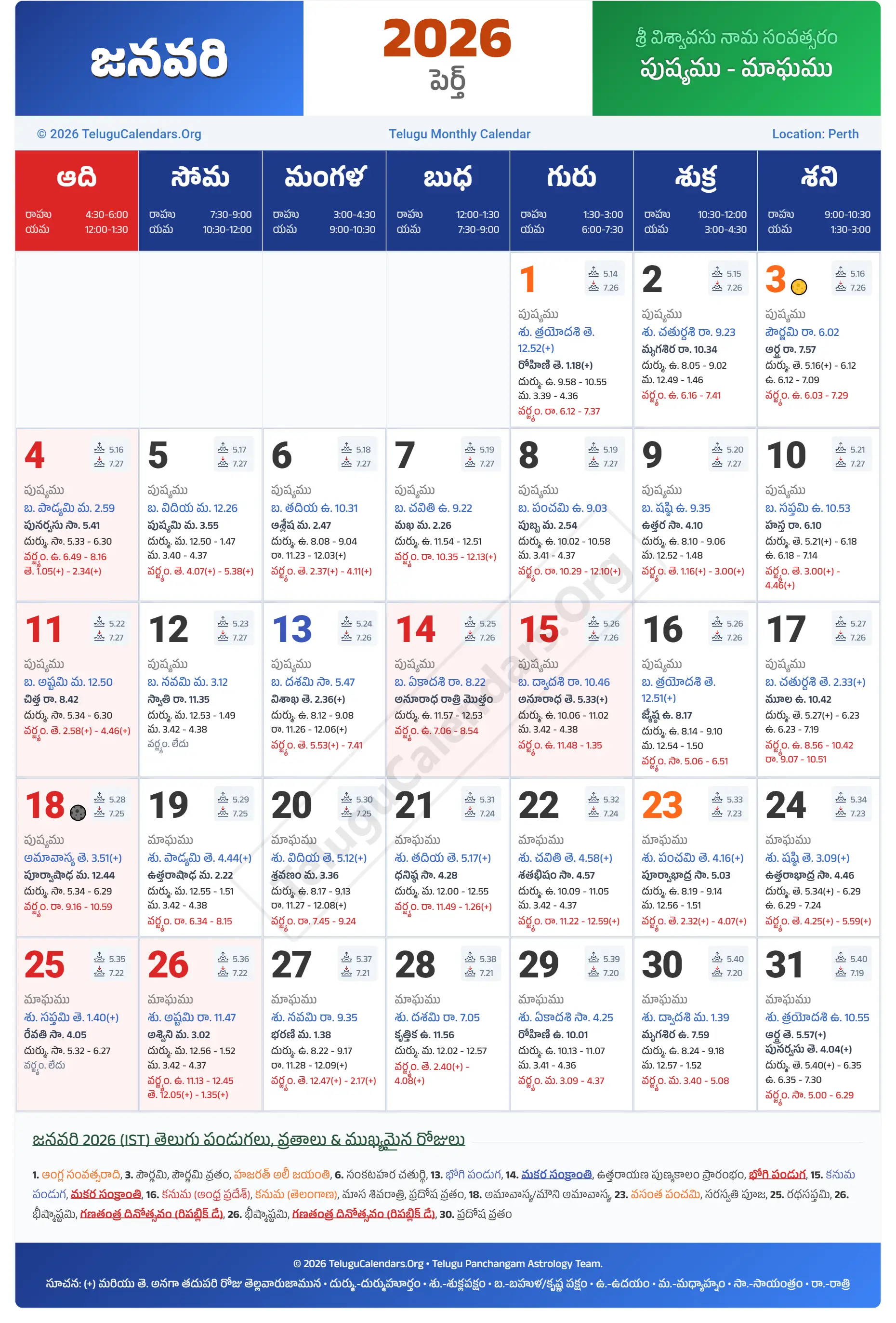Perth Telugu Calendar 2026 January PDF Download