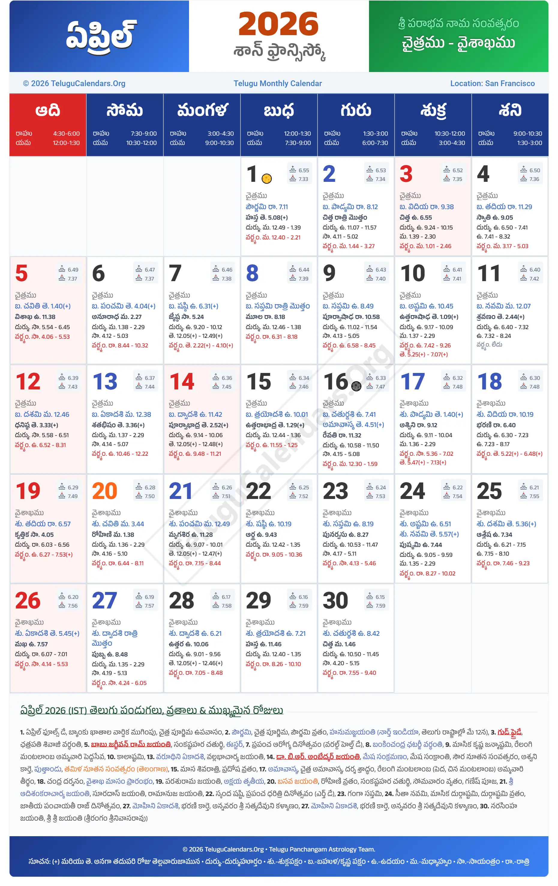 San Francisco Telugu Calendar 2026 April PDF Download
