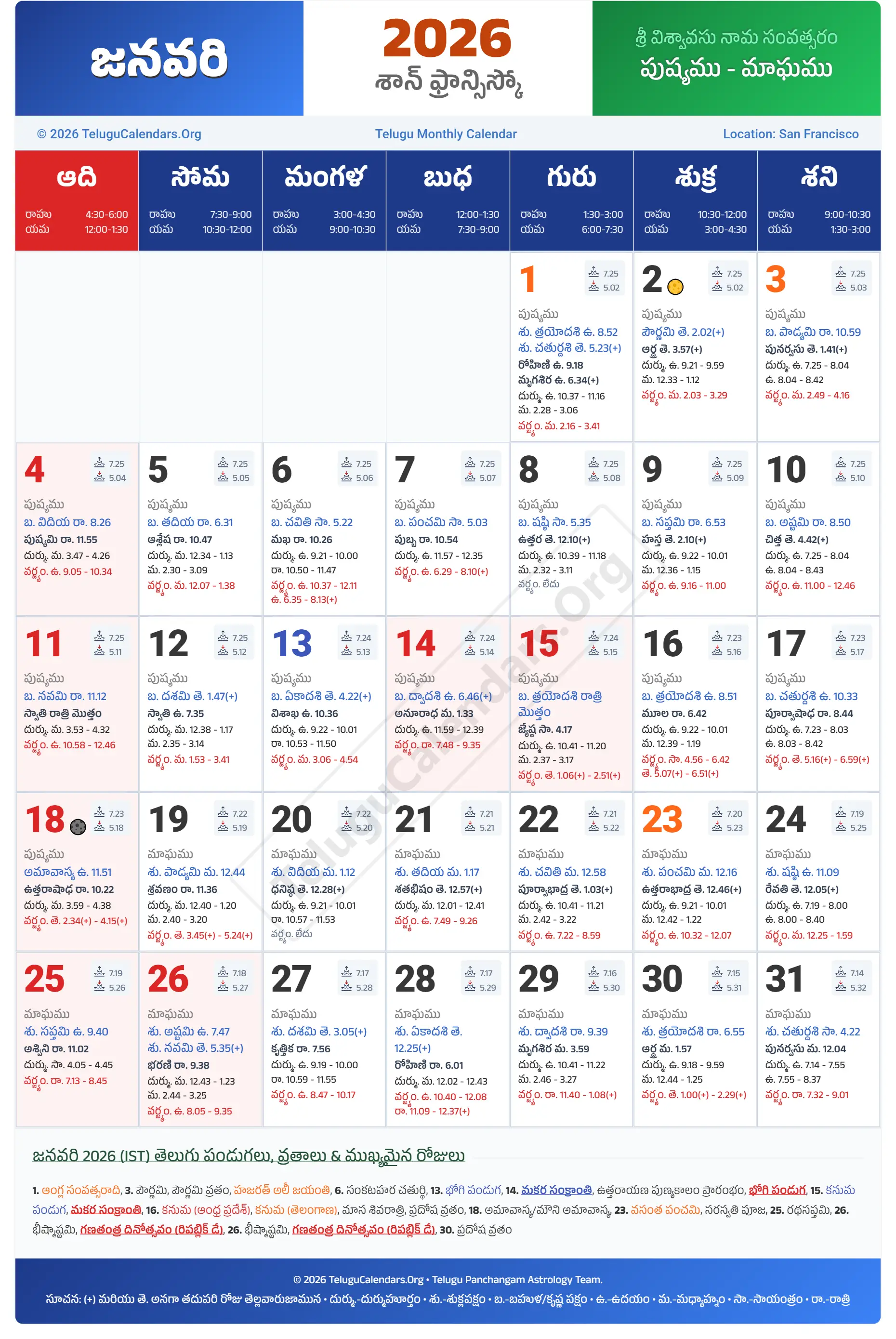 San Francisco Telugu Calendar 2026 January PDF Download