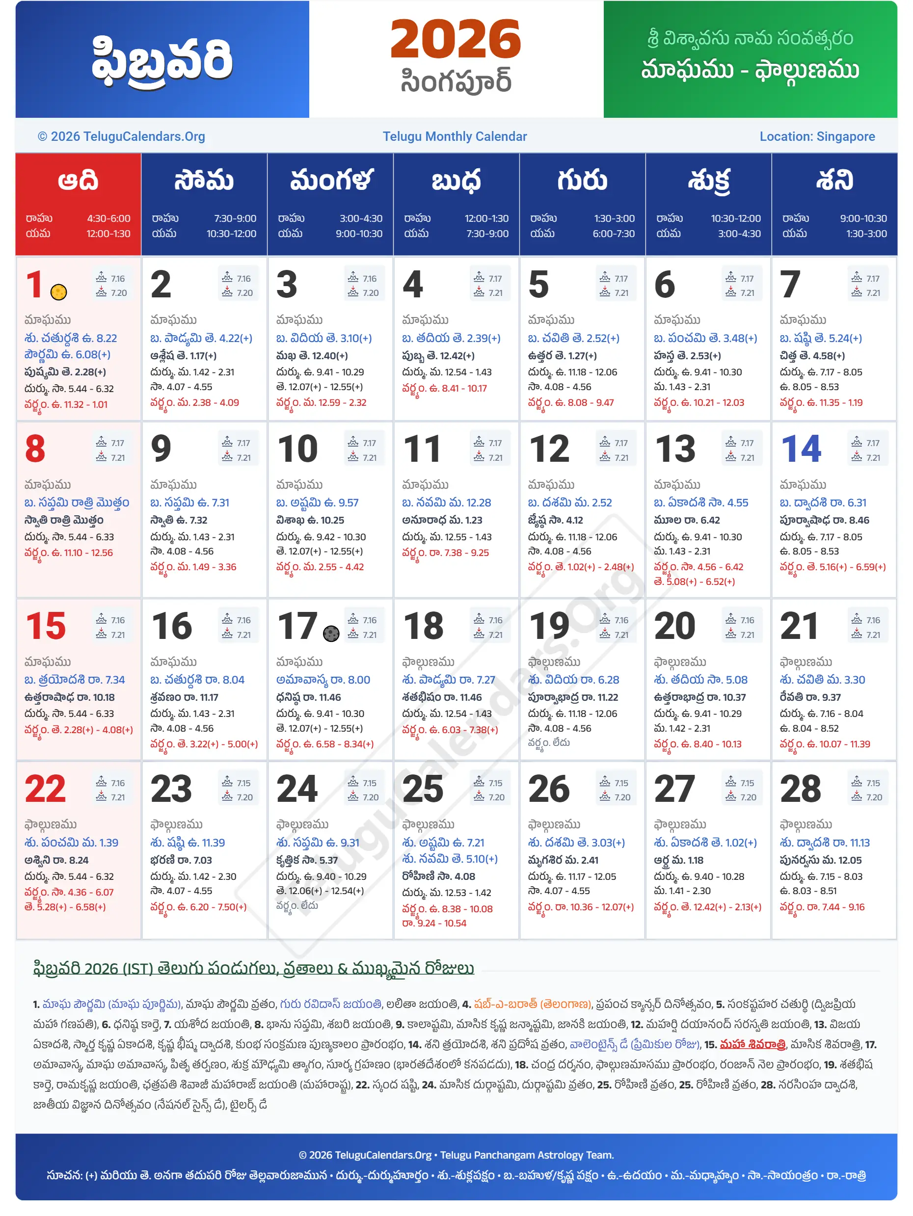 Singapore Telugu Calendar 2026 February PDF Download