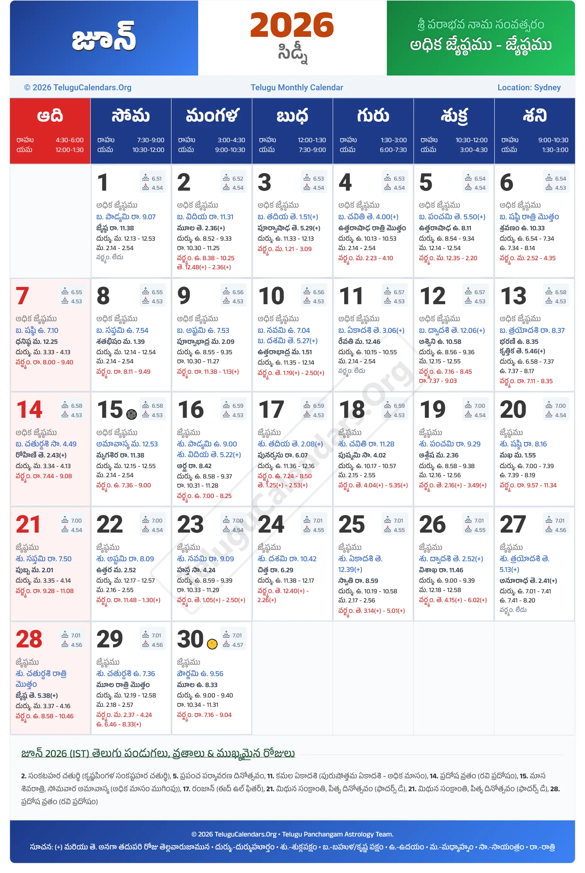 Sydney Telugu Calendar 2026 June PDF Download
