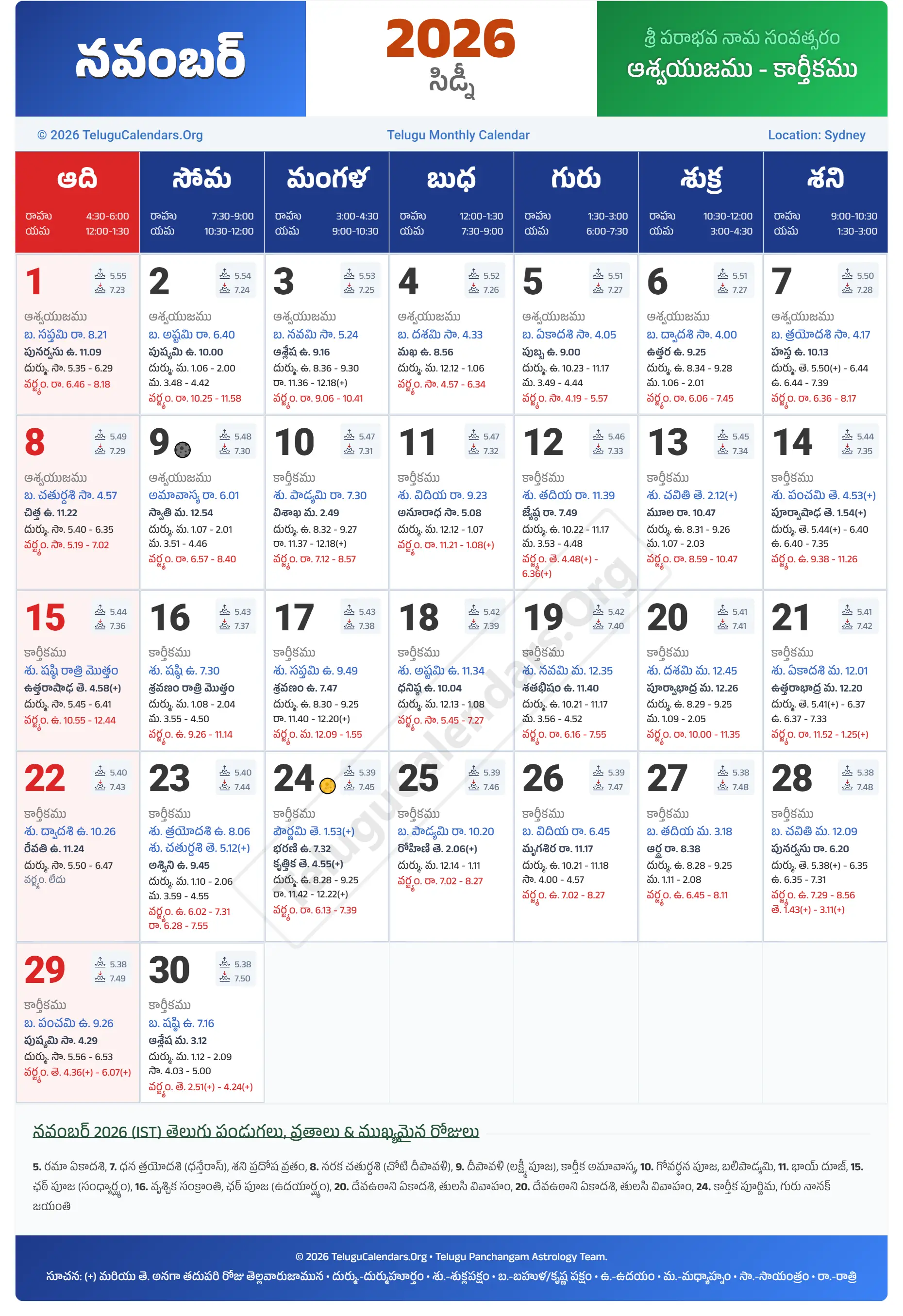 Sydney Telugu Calendar 2026 November PDF Download