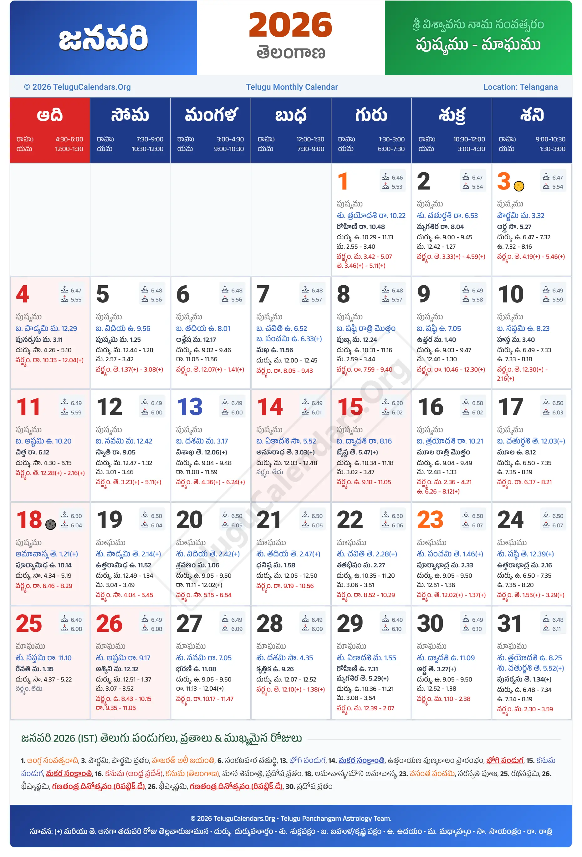 Telangana Telugu Calendar 2026 January PDF Download