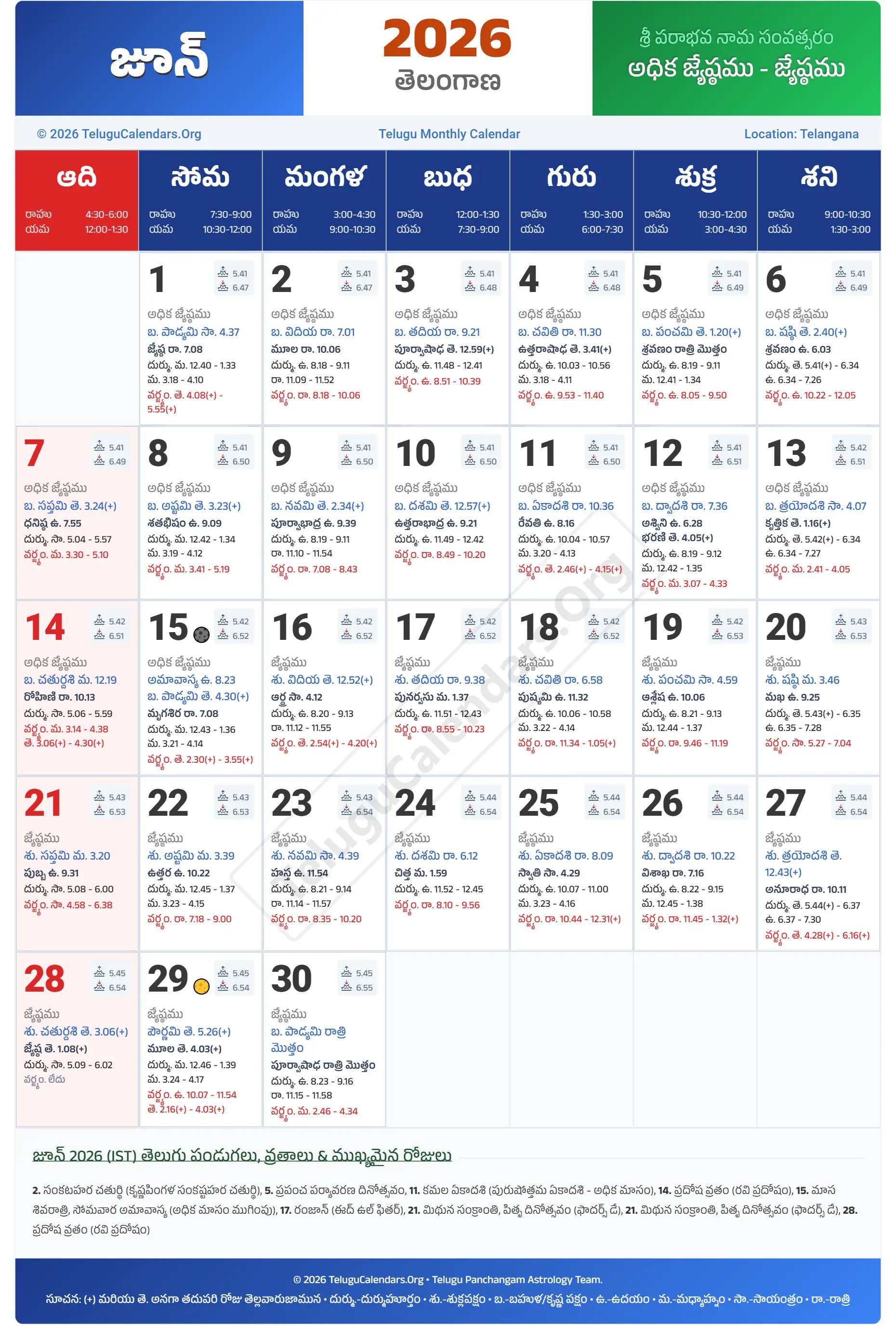 From an astrological perspective, Ekadasi is considered a highly auspicious window for spiritual fasting and devotion. According to the regional Panchangam for Telangana, we observe 2 Ekadasi tithis this month. The first one occurs in the lunar month of Jyesthamu (Adhik) on Thursday, 11 June 2026, with timings officially recorded as Ekadasi upto 10:36 PM. The next one occurs in the lunar month of Jyesthamu on Thursday, 25 June 2026, with timings officially recorded as Ekadasi upto 08:09 PM. Devotees are advised to plan their fasts and prayers strictly within these specified timings to maximize their spiritual and cosmic benefits.