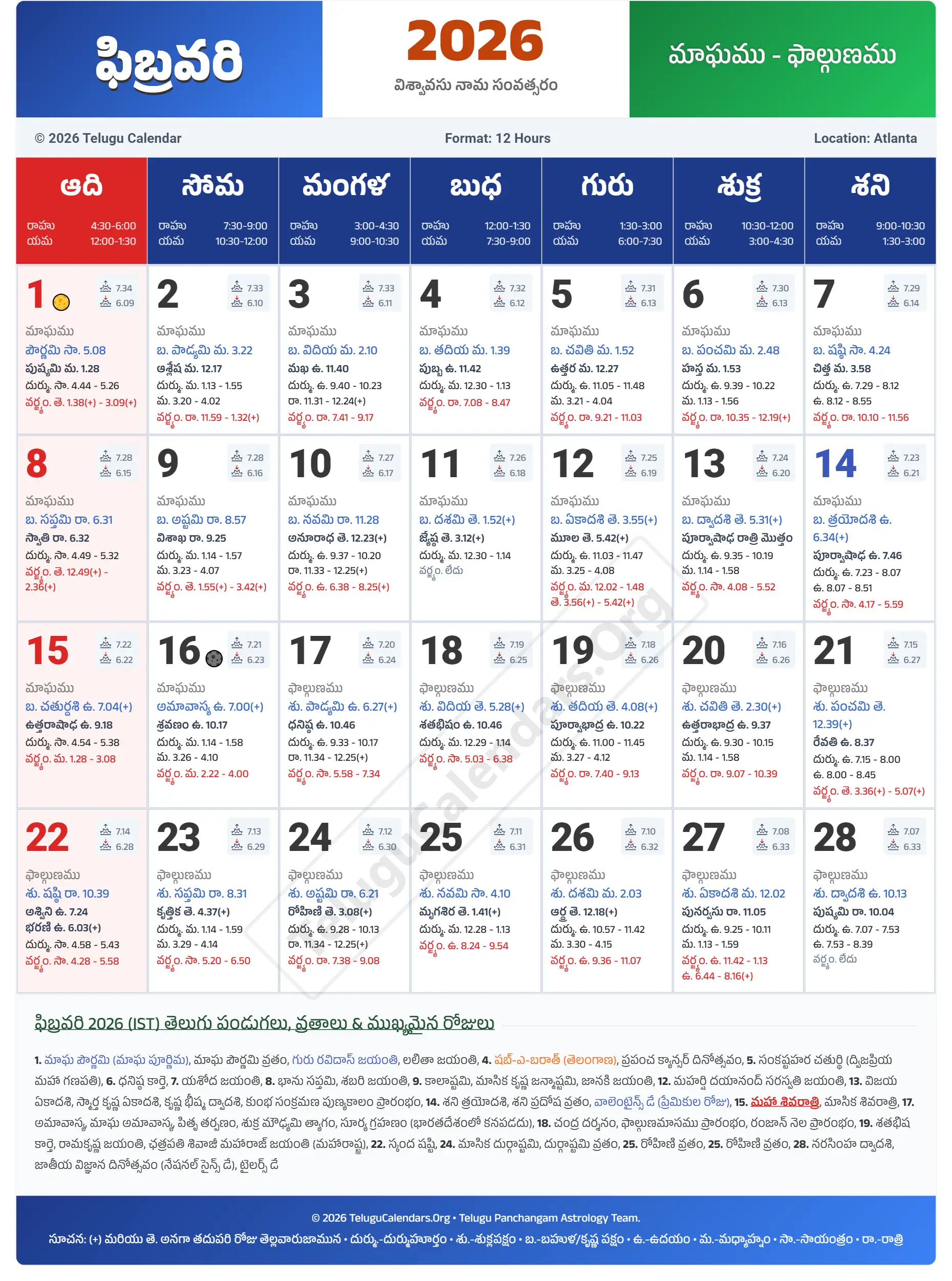 From an astrological perspective, Ekadasi is considered a highly auspicious window for spiritual fasting and devotion. According to the regional Panchangam for Atlanta, we observe 2 Ekadasi tithis this month. The first one occurs in the lunar month of Maghamu on Thursday, 12 February 2026, with timings officially recorded as Ekadasi upto 03:55 AM, Feb 13. The next one occurs in the lunar month of Phalgunamu on Friday, 27 February 2026, with timings officially recorded as Ekadasi upto 12:02 PM. Devotees are advised to plan their fasts and prayers strictly within these specified timings to maximize their spiritual and cosmic benefits.