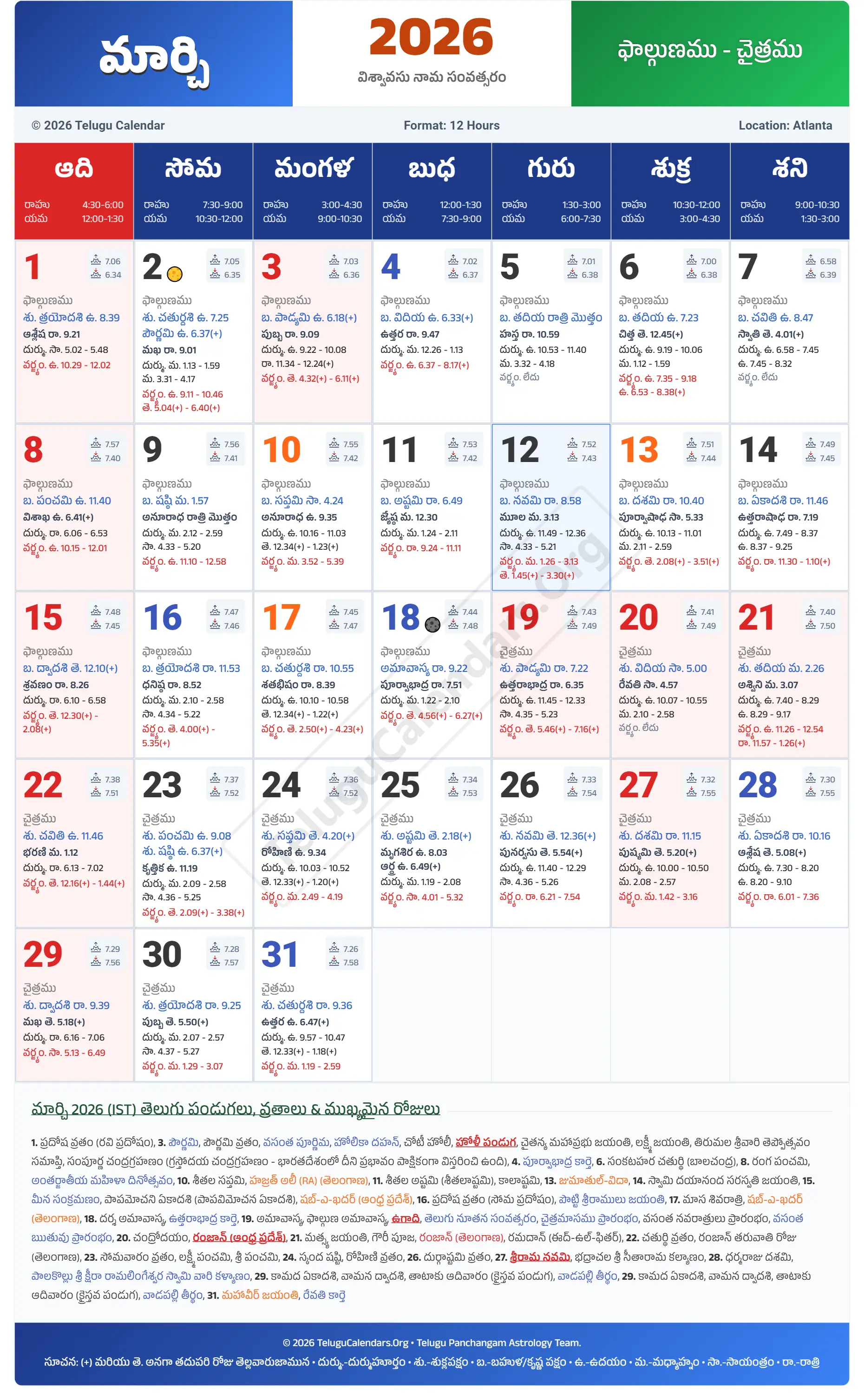 Atlanta Telugu Calendar 2026 March PDF Download