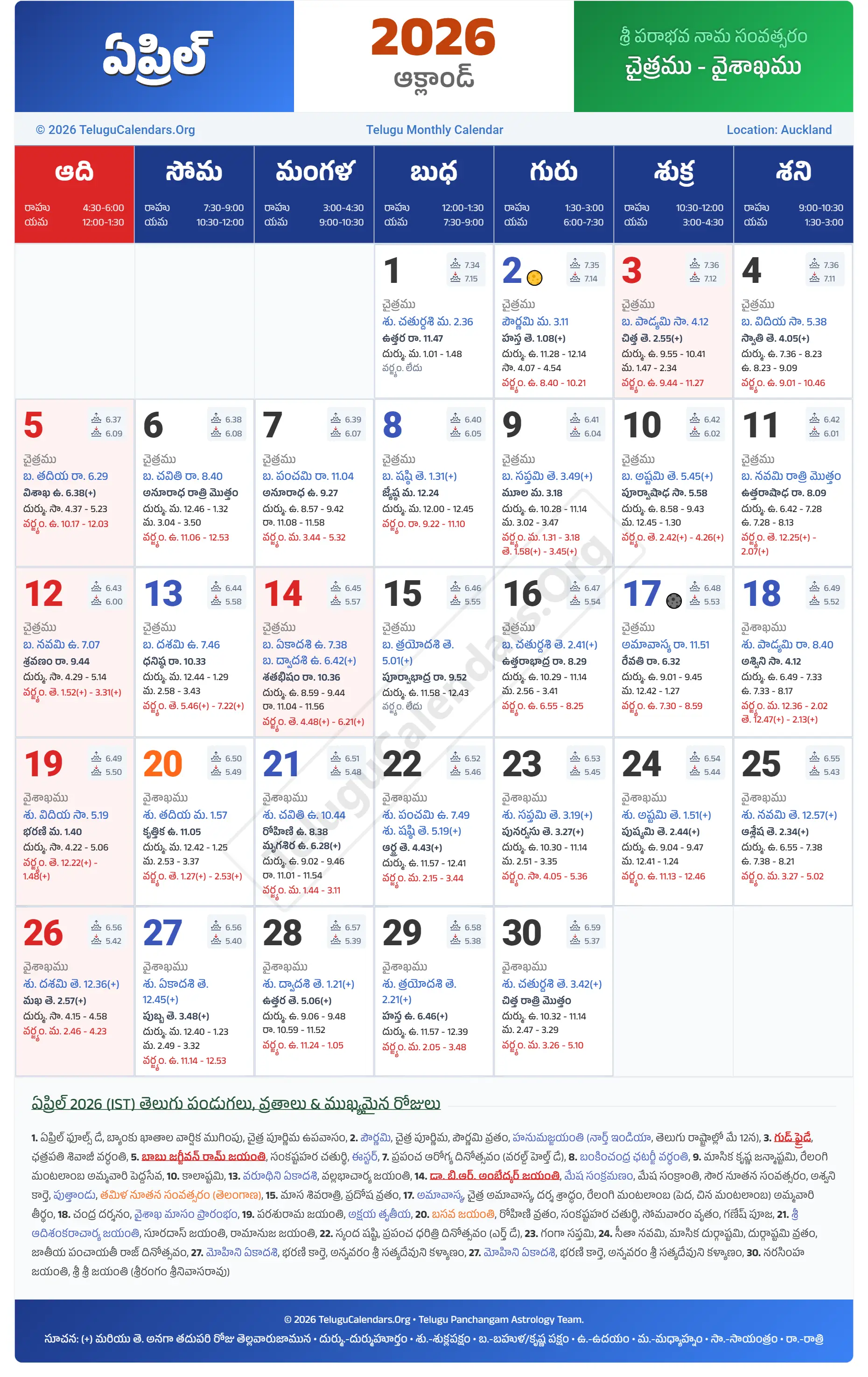 Auckland Telugu Calendar 2026 April PDF Download