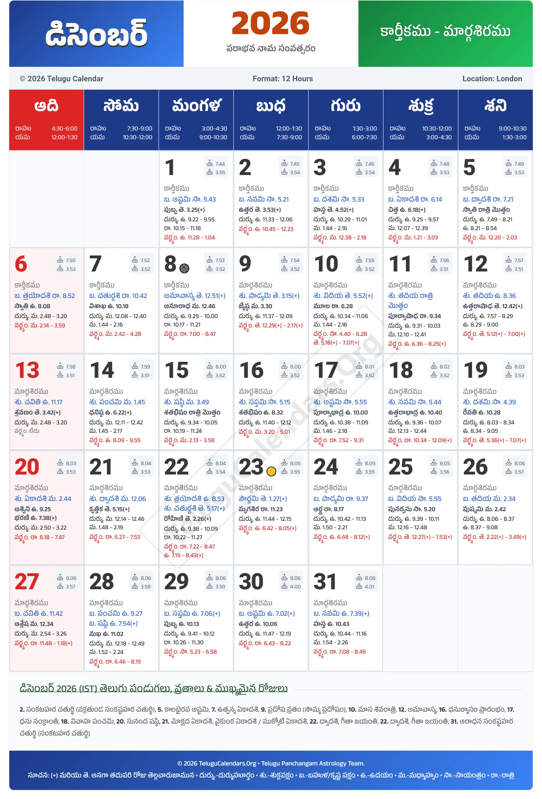 London Telugu Calendar 2026 December PDF Download