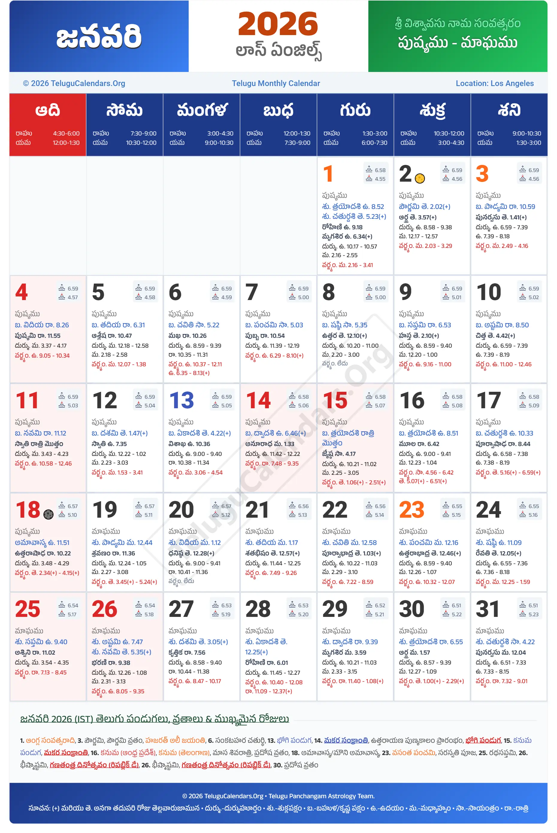 Los Angeles Telugu Calendar 2026 January PDF Download