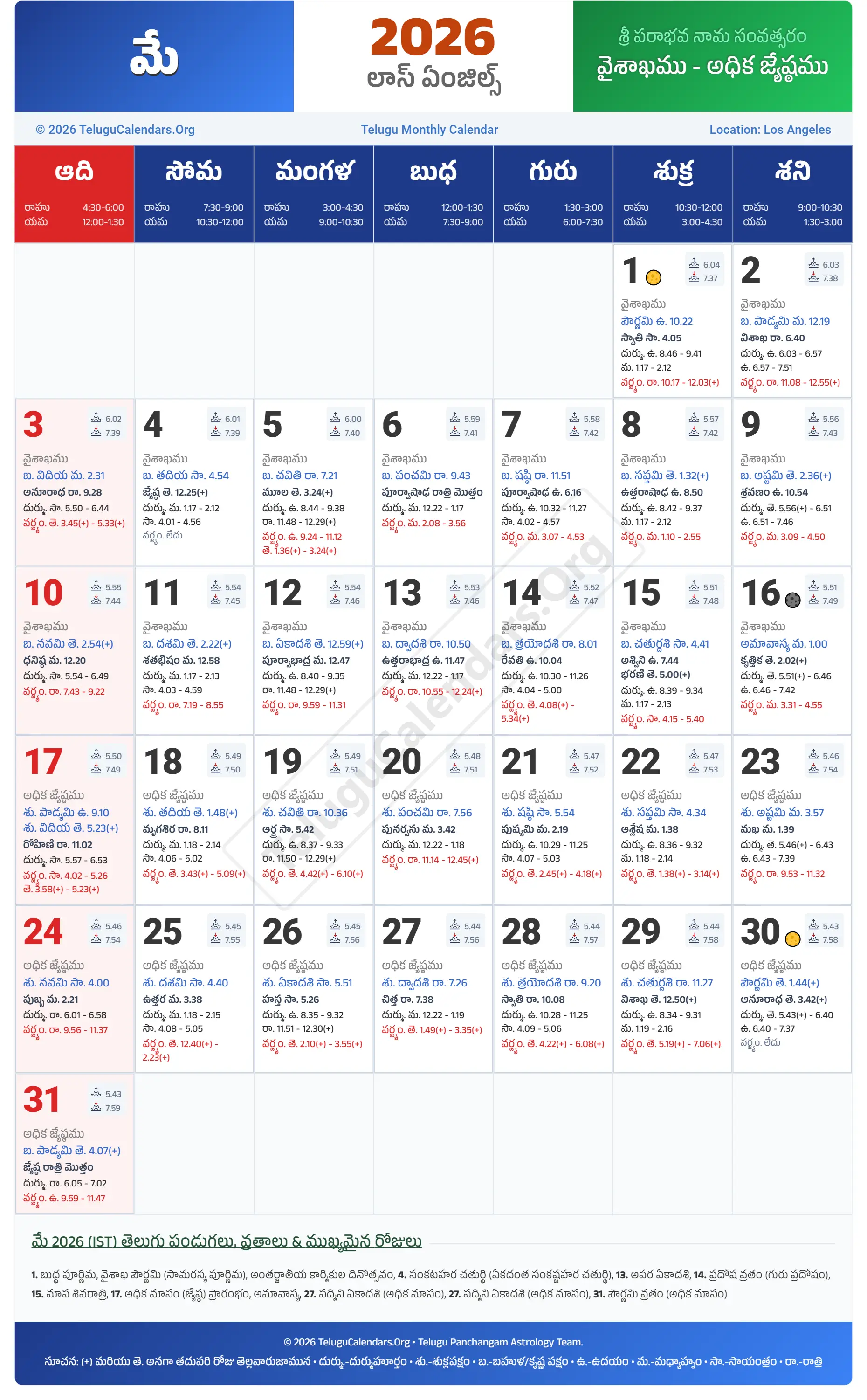 Los Angeles Telugu Calendar 2026 May PDF Download