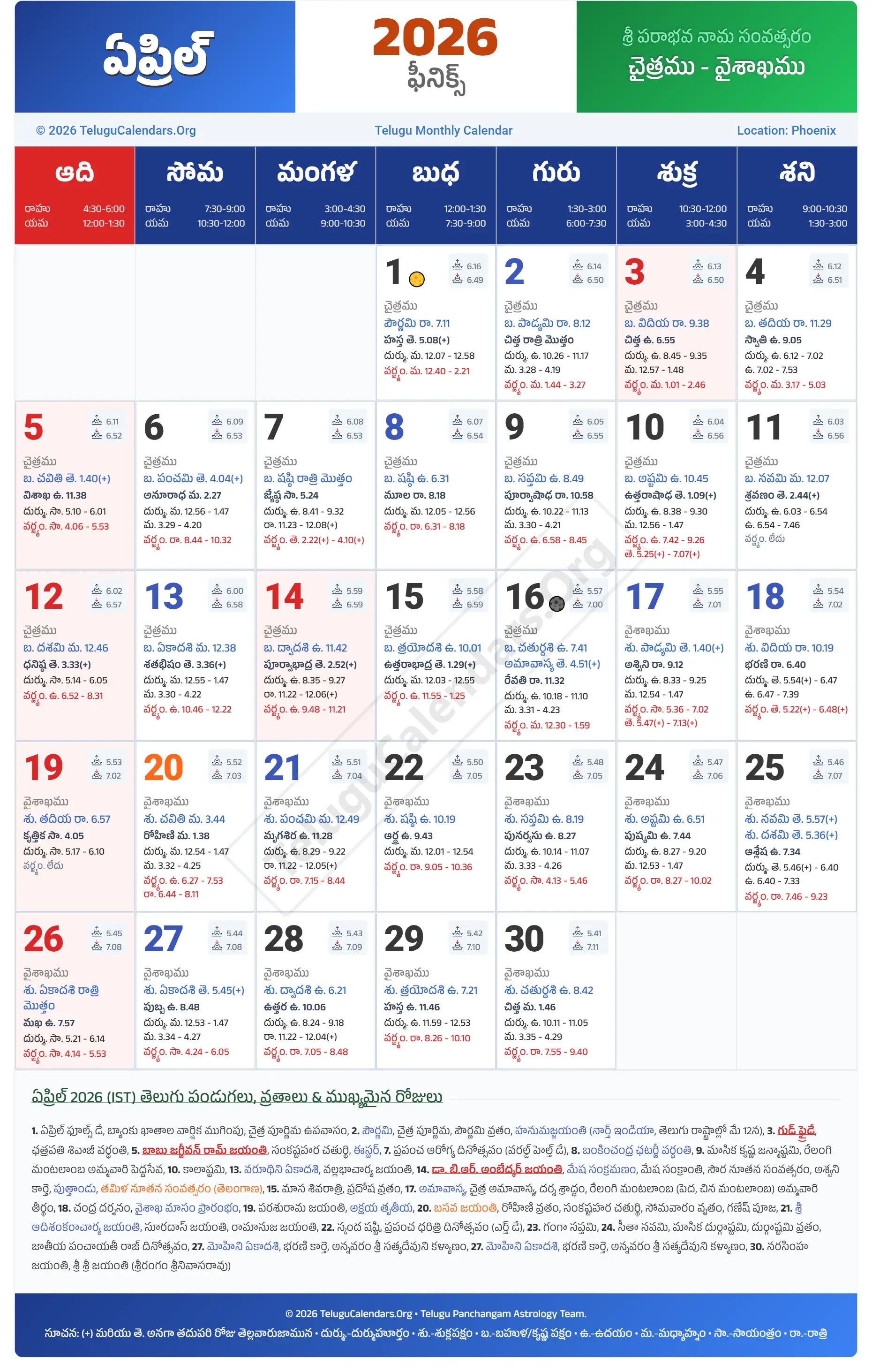 Phoenix Telugu Calendar 2026 April PDF Download