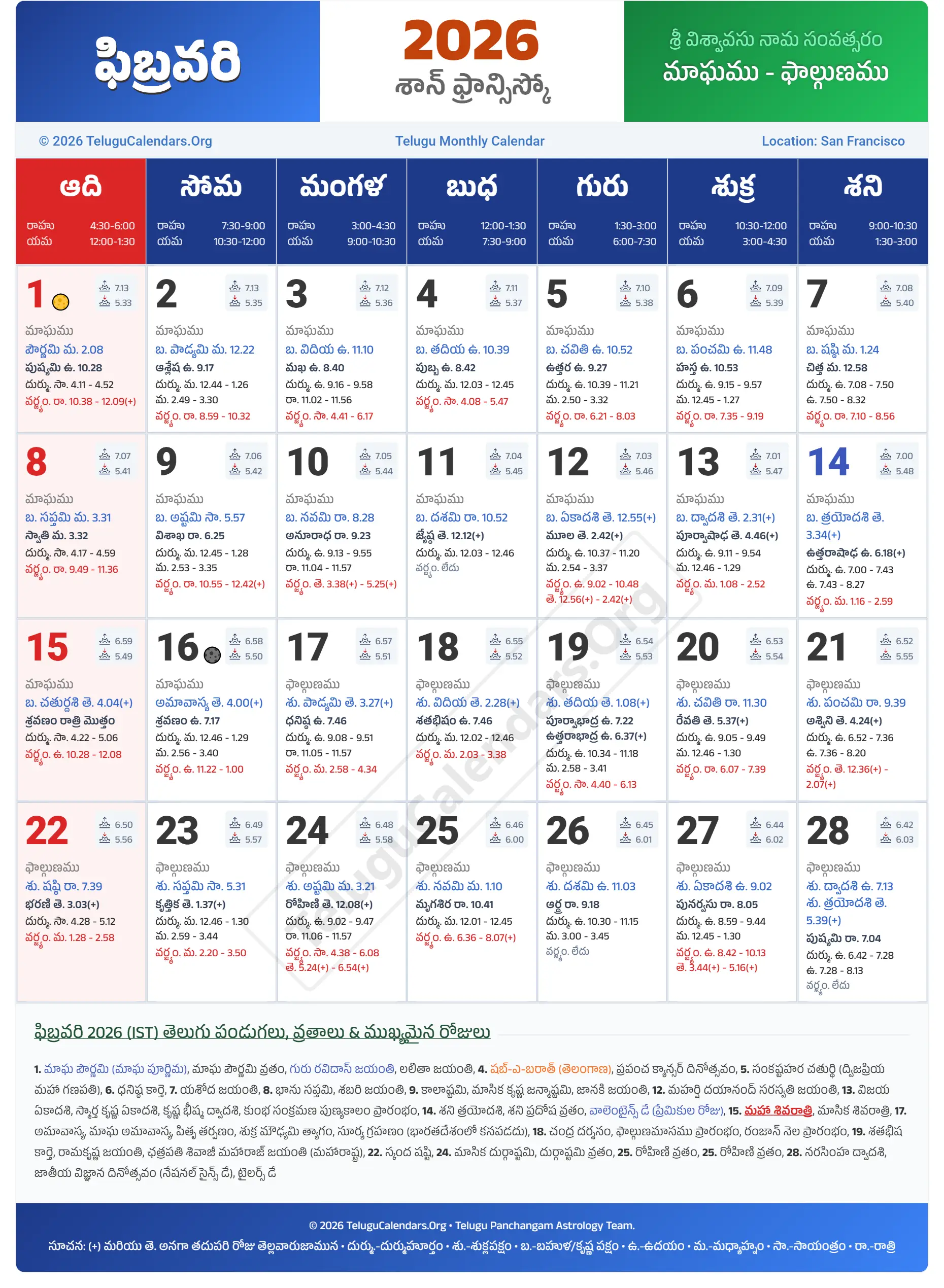 From an astrological perspective, Ekadasi is considered a highly auspicious window for spiritual fasting and devotion. According to the regional Panchangam for San Francisco, we observe 2 Ekadasi tithis this month. The first one occurs in the lunar month of Maghamu on Thursday, 12 February 2026, with timings officially recorded as Ekadasi upto 12:55 AM, Feb 13. The next one occurs in the lunar month of Phalgunamu on Friday, 27 February 2026, with timings officially recorded as Ekadasi upto 09:02 AM. Devotees are advised to plan their fasts and prayers strictly within these specified timings to maximize their spiritual and cosmic benefits.