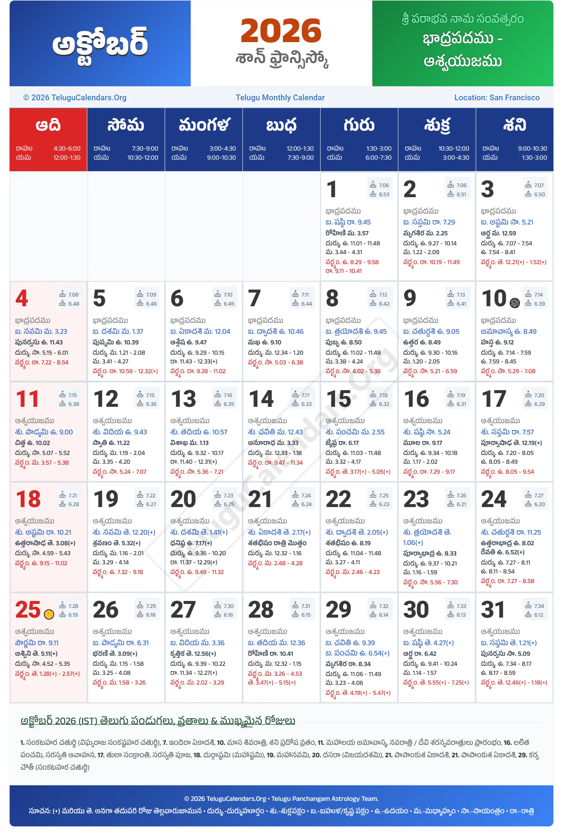 San Francisco Telugu Calendar 2026 October PDF Download