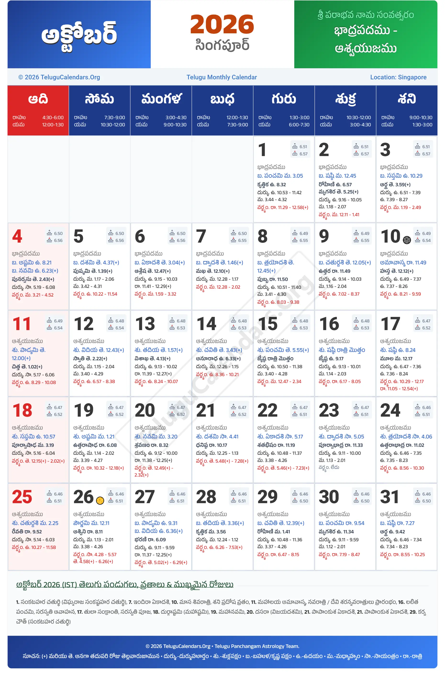 Singapore Telugu Calendar 2026 October PDF Download