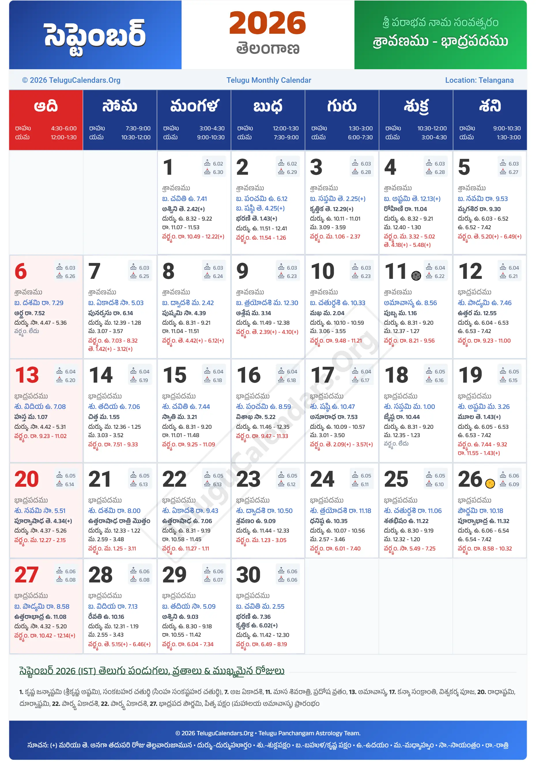 Telangana Telugu Calendar 2026 September PDF Download