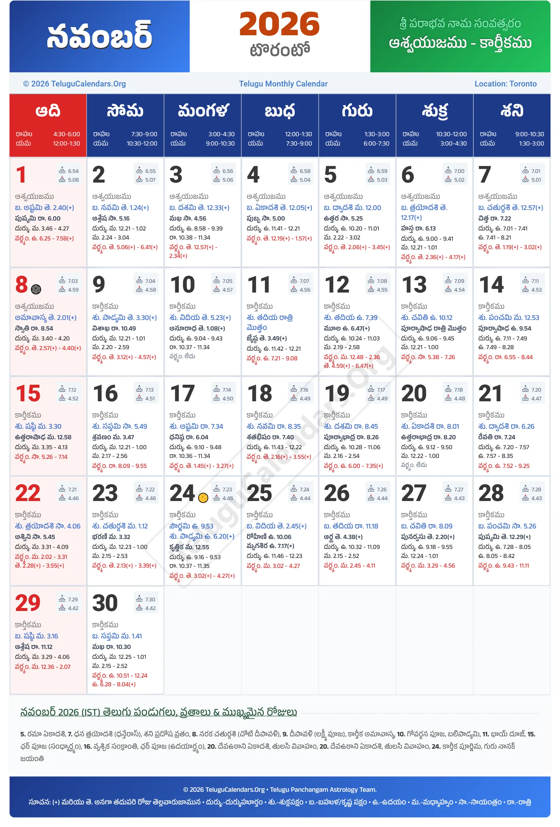 Toronto Telugu Calendar 2026 November PDF Download